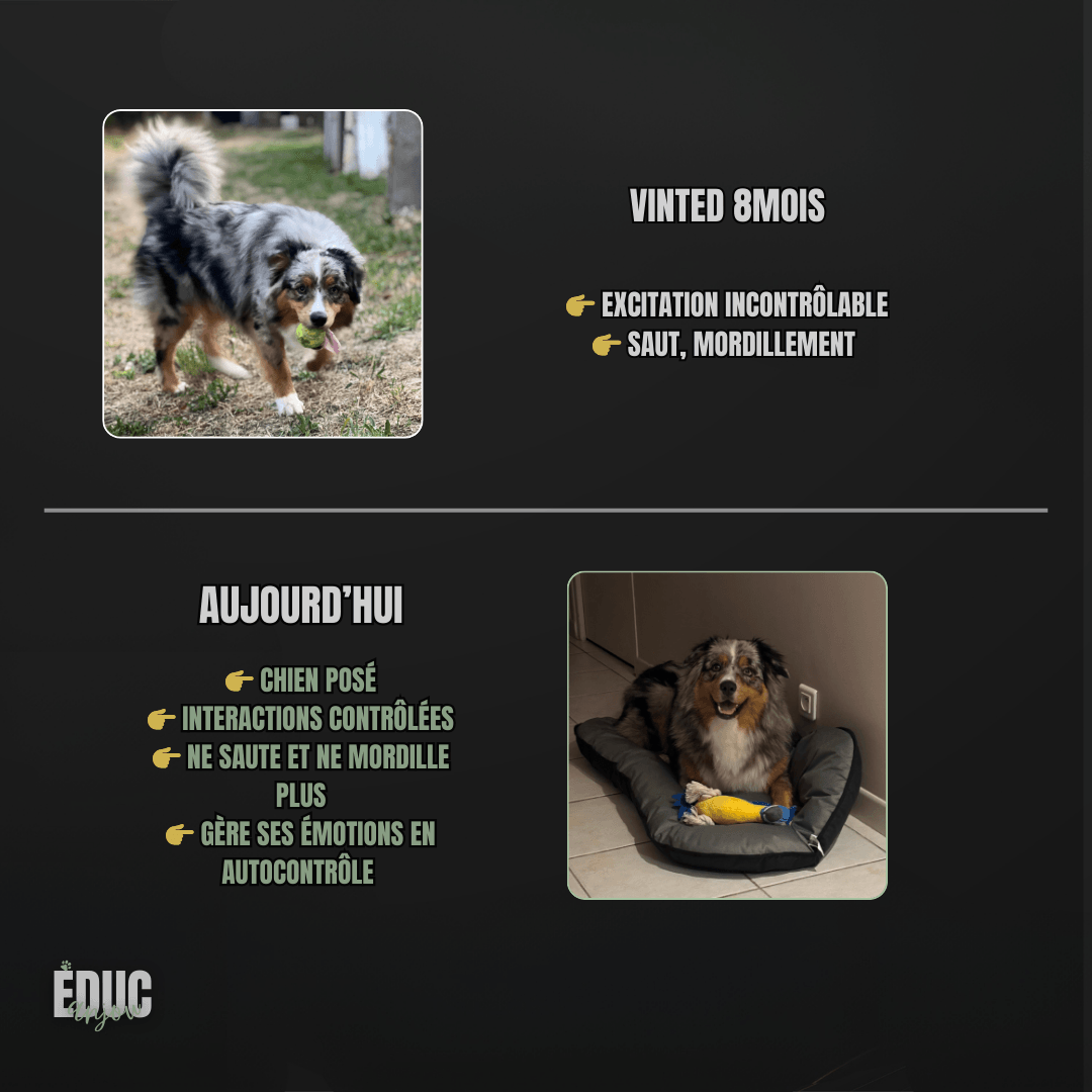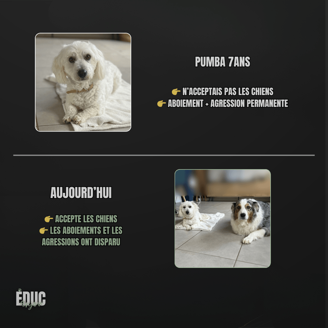 …ou toute autre situation qui rend ton quotidien avec ton chien difficile (malpropreté, crainte, désobéissance, gestion des émotions, anxiété, fugue…)